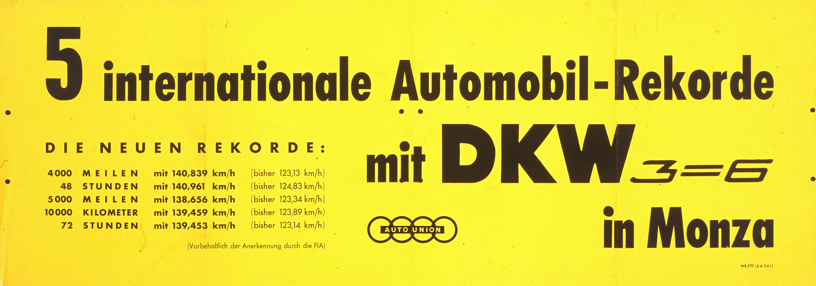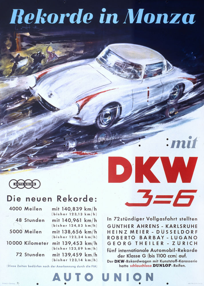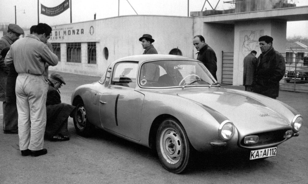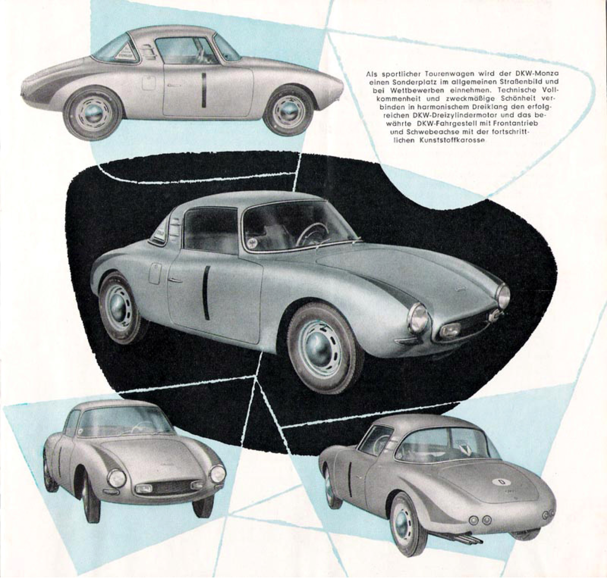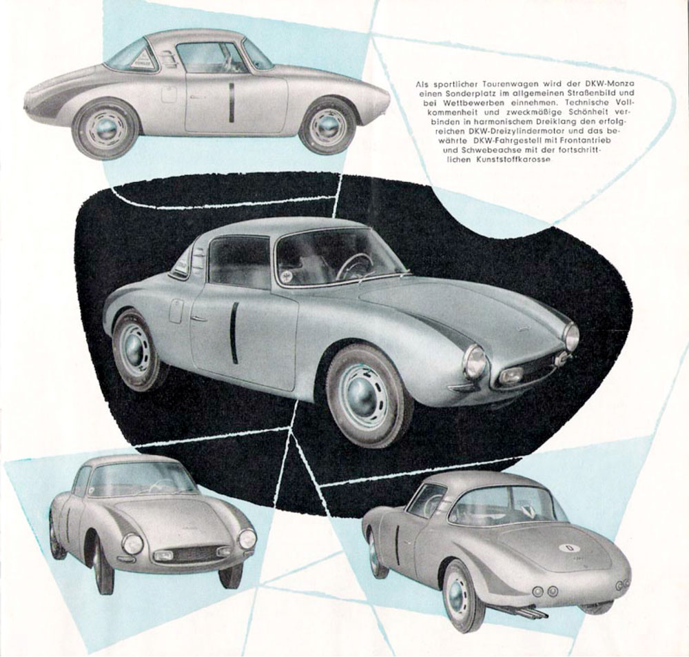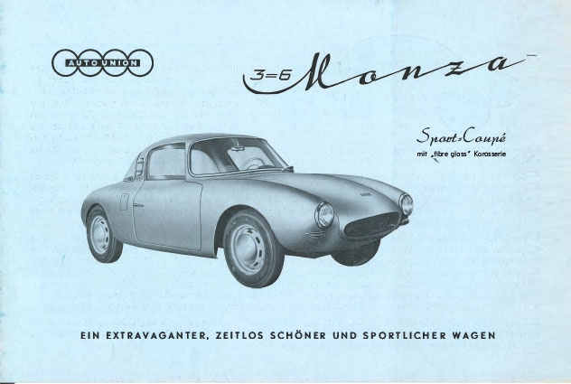 In December 1956 Günther Ahrens, Roberto Barbay, Heinz Meier and Georg Theiler drove the slightly modified fifth production model to beat the 4000 miles, 48 hours, 5000 miles, 10,000 kilometres and 72 hours long distance records for production cars on the Monza track – hence the name of this two-seater coupé. Auto Union bought the record winning car back and sent it on a promotional tour.